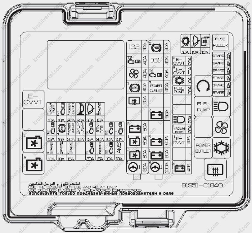Данный автомобиль имеет две (или три) панели предохранителей. Одна располагается под панелью со стороны водителя, остальные - в отсеке двигателя возле аккумуляторной батареи.