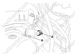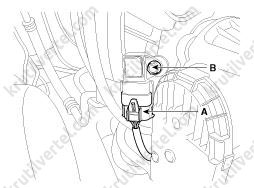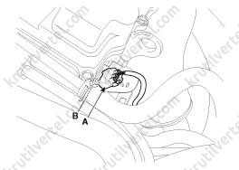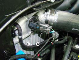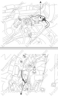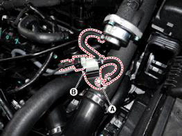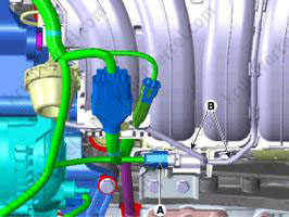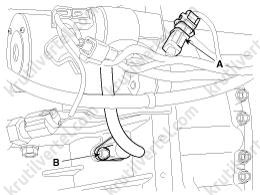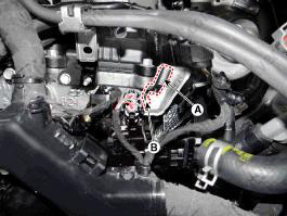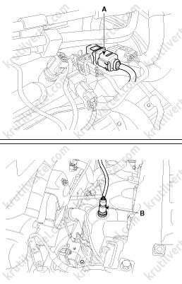 3. Отключите соединитель (A) электромагнитного клапана управления RCV и шланг отвода паров (В).