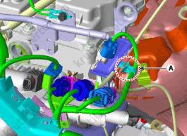 5. Отсоедините электрический разъем (А) датчика RPS, затем снимите датчик (А) с топливной рампы.