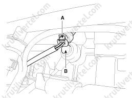 5. Снимите фиксатор (A) штока VCMA и отсоедините соединительную тягу заслонки (B) с помощью отвертки.
