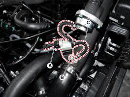 2. Отсоедините разъем (A), отверните болт крепления (B) и отсоедините шланги RCV (C), затем снимите электромагнитный клапан управления RCV.