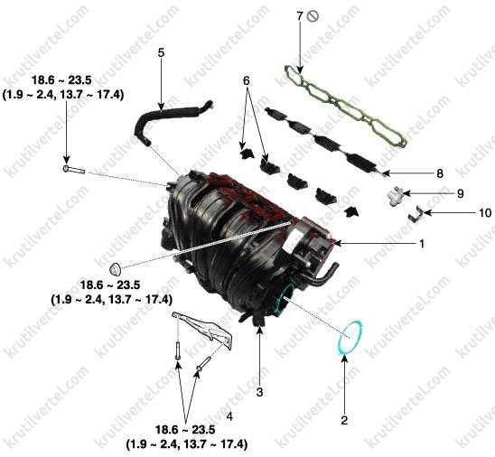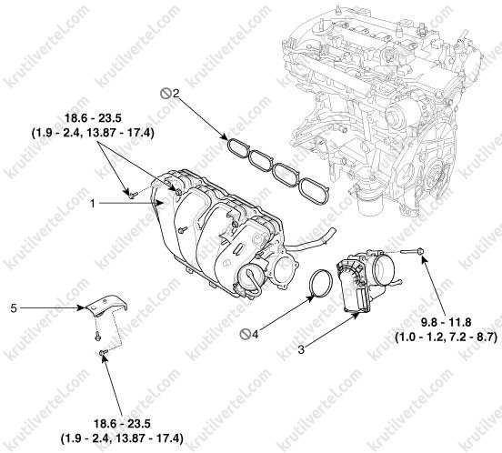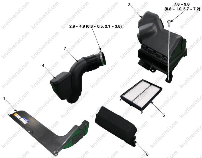 Момент затяжки при установке: 7,8 – 9,8 Н·м (болты воздушного фильтра) и 2,9 – 4,9 Н·м (шланговый хомут).