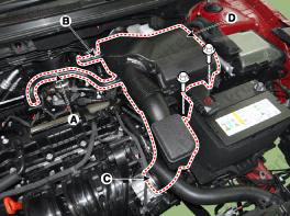 - Отсоедините воздухозаборный рукав (С) и снимите корпус воздушного фильтра (D).