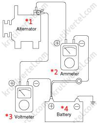 b. Отсоедините выходной провод от вывода «B» генератора. Подсоедините положительный (+) измерительный провод амперметра к выводу «B» генератора, а отрицательный (-) измерительный провод амперметра – к выходному проводу. Подсоедините положительный (+) измерительный провод вольтметра к выводу «B» генератора, а отрицательный (-) измерительный провод вольтметра – к положительной (+) клемме аккумуляторной батареи.