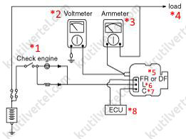 - Значение выходного тока зависит от электрической нагрузки и температуры генератора. Следовательно, номинальный выходной ток может быть не достигнут. В этом случае для разрядки аккумуляторной батареи оставьте фары включенными или используйте фары другого автомобиля для увеличения электрической нагрузки. Номинальный выходной ток может быть не достигнут в случае высокой температуры окружающей среды или самого генератора. В этом случае перед повторным испытанием примете меры к снижению температуры.