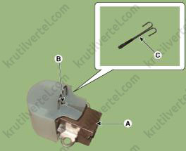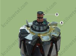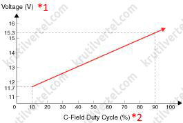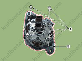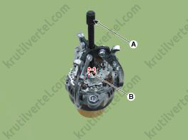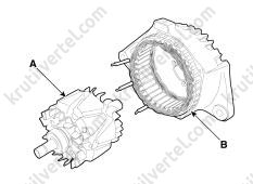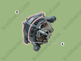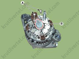 Генератор оснащен 8 диодами для выпрямления переменного тока. Следовательно, на выводе «B» генератора возникает постоянный ток. Кроме того, напряжение подзарядки регулируется системой контроля напряжения аккумуляторной батареи.