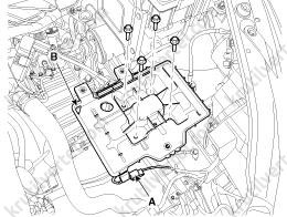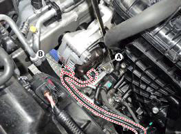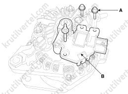 5. Отсоедините передний разъем (А) и, отвернув болты крепления, снимите полку аккумуляторной батареи (В).