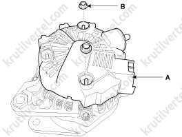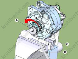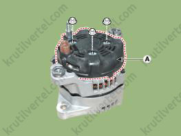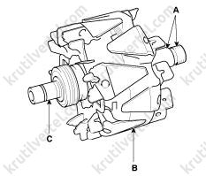 Генератор регулируется системой контроля напряжения аккумуляторной батареи. Основными компонентами генератора являются ротор, статор, выпрямитель, конденсатор, щетки, подшипники и поликлиновый шкив. Держатель щетки содержит электронный регулятор напряжения.