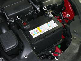 После повторного подключения кабеля к минусовой (-) клемме аккумуляторной батареи функции AMS и ISG не будут работать до стабилизации системы (примерно четыре часа). В случае отсоединения кабеля от минусовой (-) клеммы аккумуляторной батареи во время ремонтных работ на автомобиле с функцией ISG после окончания ремонта следует выполнить процедуру перекалибровки датчика аккумуляторной батареи: