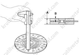 4. Измерьте глубину (В) от поверхности фрикционных накладок сцепления до заклепки. Если измеренное значение меньше требуемого, замените диск.