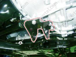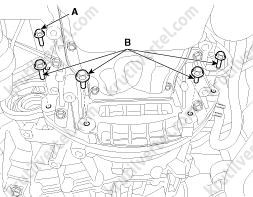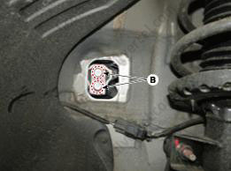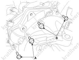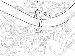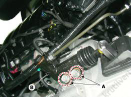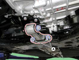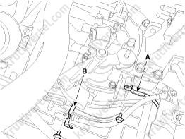4. Отверните болты крепления, после чего отсоедините провод «массы» (A) и кронштейн трубки сцепления (В).