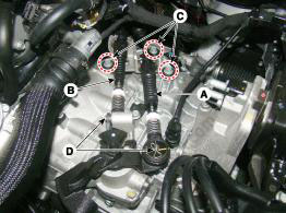 - Извлеките два шплинта (D) и затем отсоедините трос переключения передач (A) и трос выбора передач (B).
