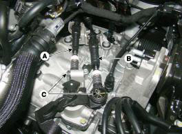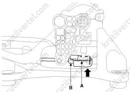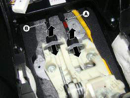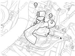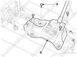 5. Отверните четыре болта крепления (А) и затем снимите узел рычага переключения (В).