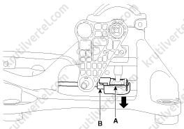3. Извлеките фиксатор (A), затем отсоедините наконечник троса переключения передач (B) от штифта.