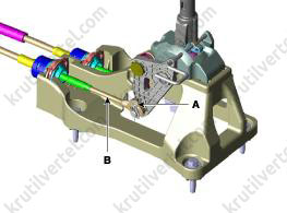 4. Извлеките трос переключения передач (А) и трос выбора передач (В) из кронштейнов.