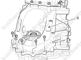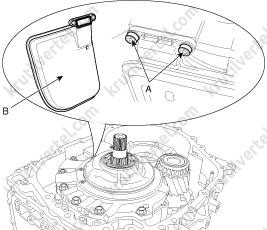 5. Отверните болты крепления и затем снимите корпус гидротрансформатора (В) с корпуса коробки передач (А).