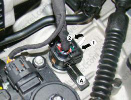2. Отсоедините электрический разъем (А) датчика частоты вращения первичного / вторичного вала.