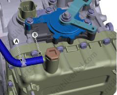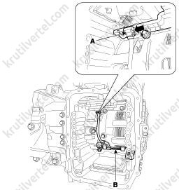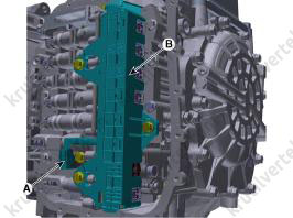 9. Отверните болты крепления и затем снимите разъем электромагнитного клапана (В) и датчик температуры масла (А) с блока управляющих клапанов.