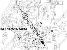 7. Слегка натяните трос переключения передач (C) в направлении стрелки «F», чтобы устранить люфт троса переключения передач.