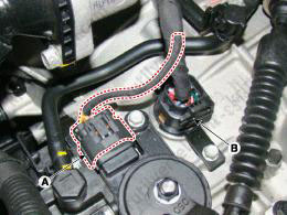 6. Ослабьте хомут крепления (А) и затем отсоедините шланг сапуна (В).
