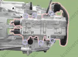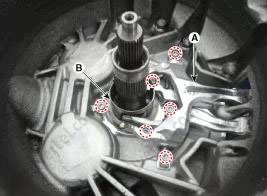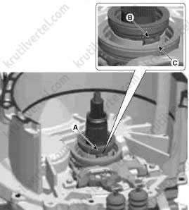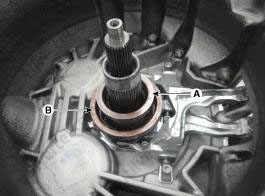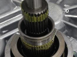 - Перед установкой двойного сцепления в сборе проверьте, что шлицевая часть первичного вала (A) достаточно смазана. Если шлицевая часть первичного вала не смазана, нанесите смазку на расстоянии до 10 мм от каждого конца шлица.