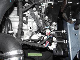 А. Разъем выключателя блокировки. В. Разъем привода сцепления. С. Разъем электромагнита привода исполнительного механизма переключения передач. D. Разъем датчика частоты вращения первичного вала.