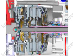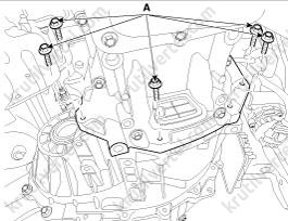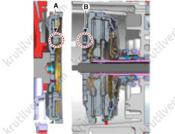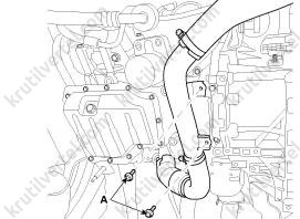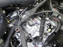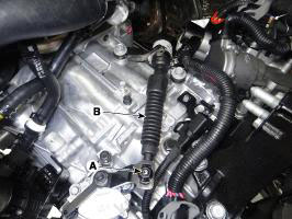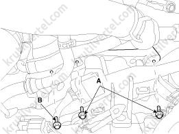 9. Отверните два верхних болта крепления (А) коробки передач и болт крепления (В) стартера.