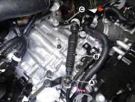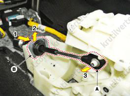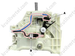 - Отсоедините трос переключения передач (В) от кронштейна рычага (стрелки 1 и 2).