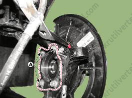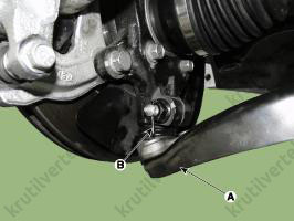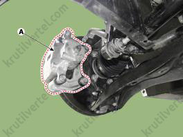 2. Отверните гайку крепления (А) приводного вала с передней ступицы, нажав на педаль тормоза.