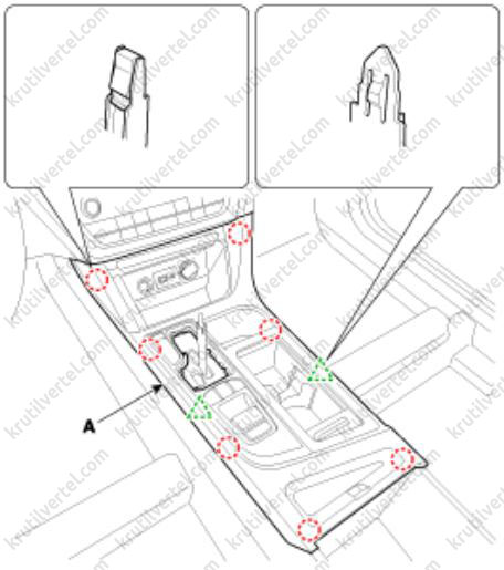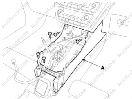 10. Отверните болты и винты крепления, после чего снимите переднюю часть (А) напольной консоли.