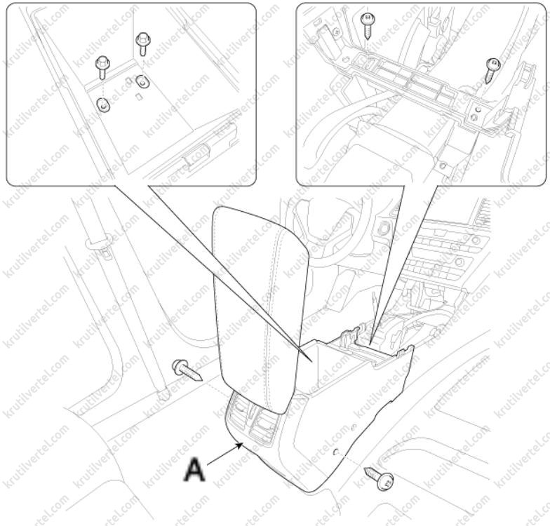 8. Отверните болты и винты крепления, после чего снимите заднюю часть (А) напольной консоли.
