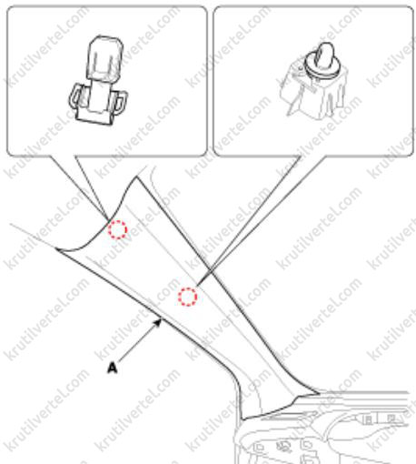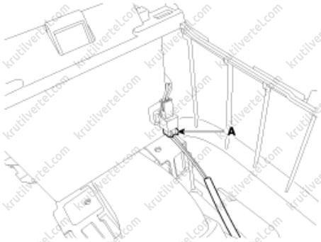 12. Снимите фиксаторы в передней стойке и отсоедините главный разъем (А) потолочной обшивки.
