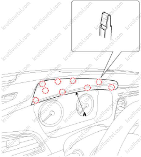 4. С помощью отвертки с плоским шлицем или специального съемника снимите козырек (А) комбинации приборов.