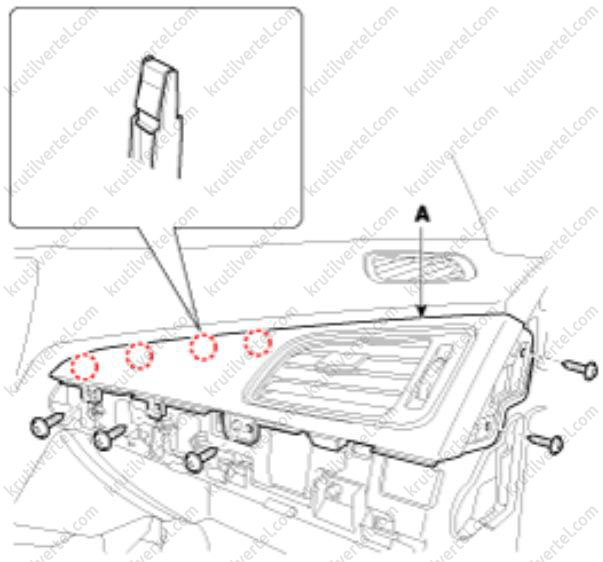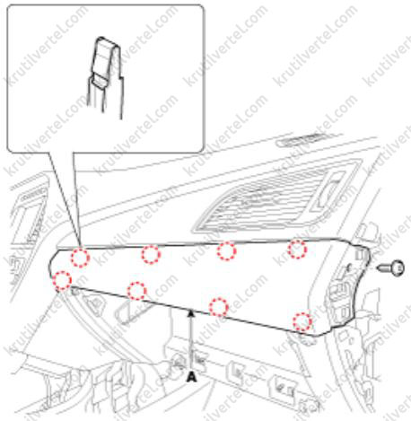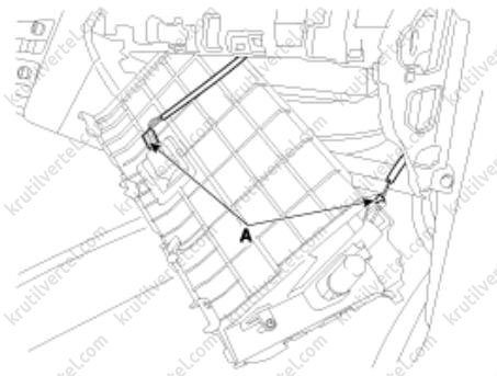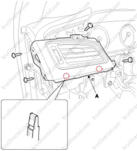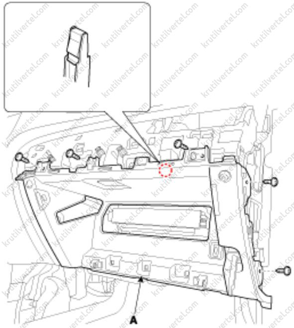 8. Отверните винты крепления и затем снимите корпус (А) перчаточного ящика с помощью отвертки.