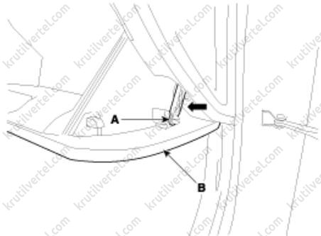 2. Отсоедините пневматический амортизатор (А) от перчаточного ящика (В).