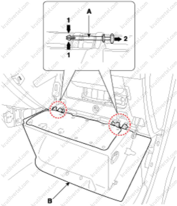 3. Извлеките стопорные штифты (A), а затем снимите перчаточный ящик (B).