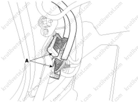 13. Снимите фиксаторы в задней правой стойке и отсоедините электрические разъемы (А).