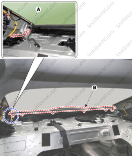 - При прокладке жгута проводов (A) в потолочной обшивке закрепляйте его непрерывной полоской термоклея с помощью клеевого пистолета.