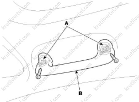 1. Откройте заглушки (А), отверните винты крепления, после чего снимите потолочный поручень (В).