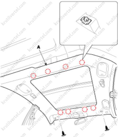14. Отсоедините фиксаторы и снимите потолочную обшивку (A).