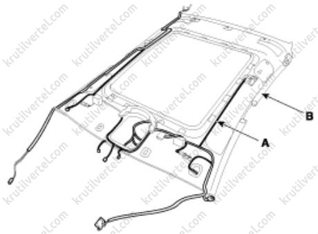18. Снимите жгут проводов (A) с потолочной обшивки (B).