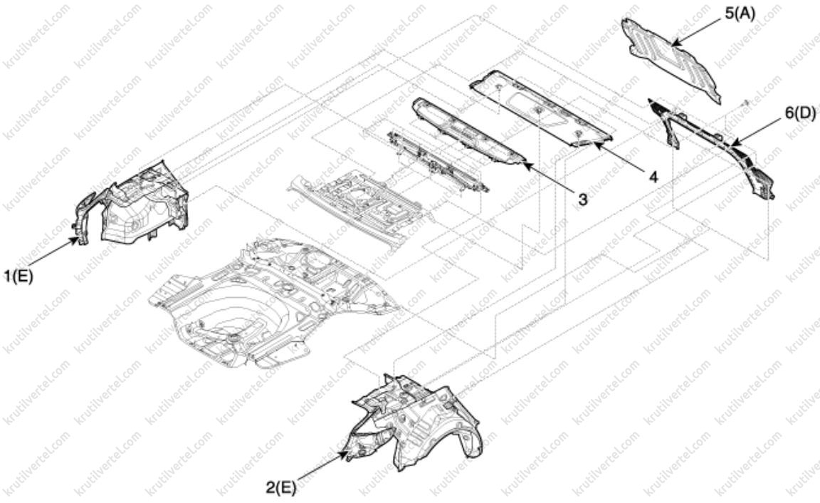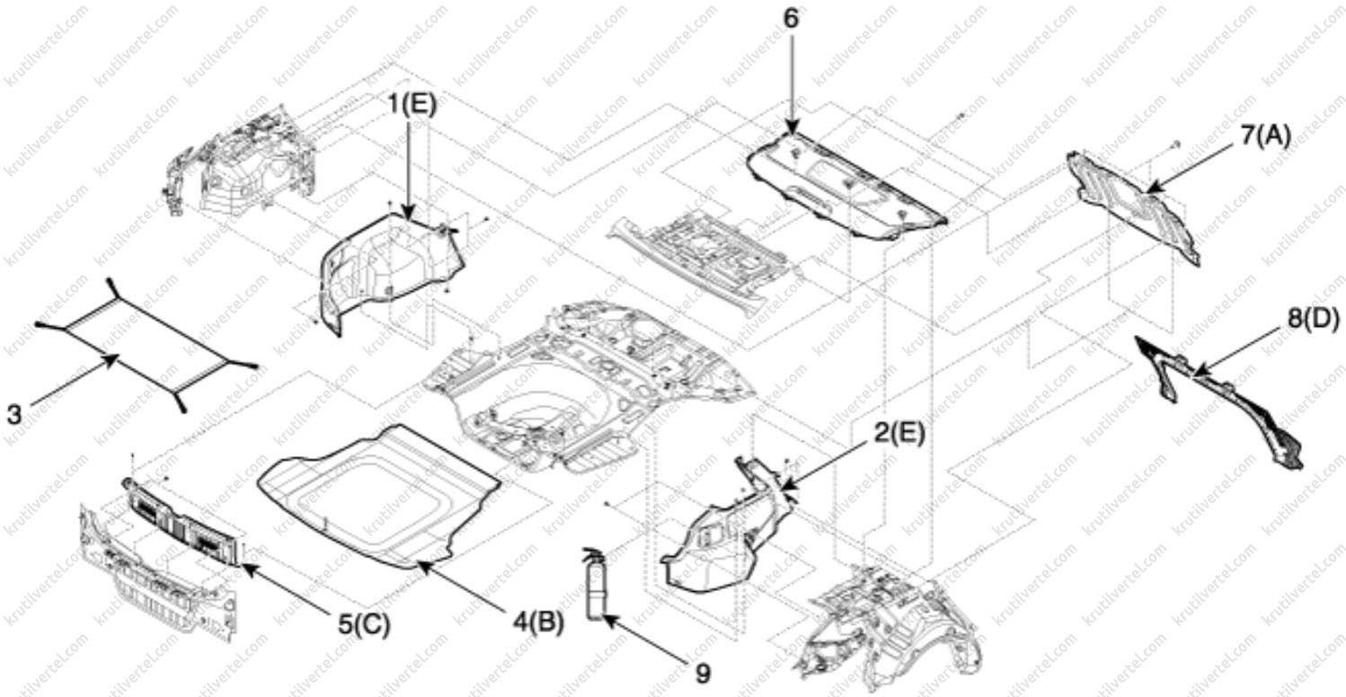 8. Отверните винты крепления и затем снимите боковую обшивку багажного отделения (Е).