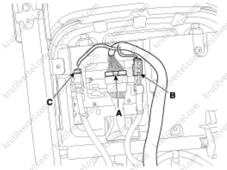 3. Отсоедините главный электрический разъем (А), разъем (В) модуля боковой подушки безопасности и разъем (С) замка ремня безопасности переднего сиденья.
