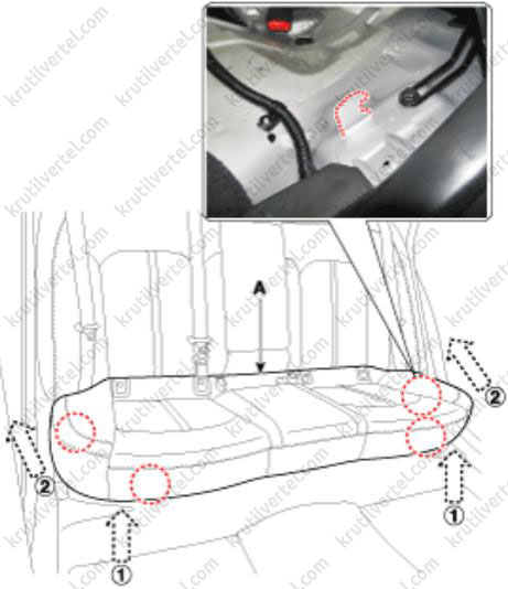 1. Снимите узел (А) подушки заднего сиденья: