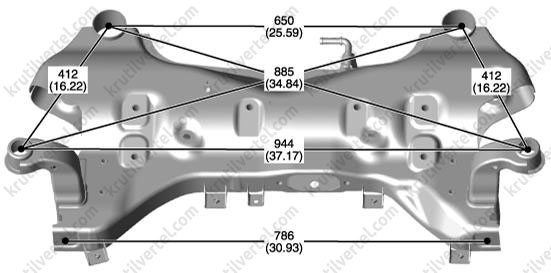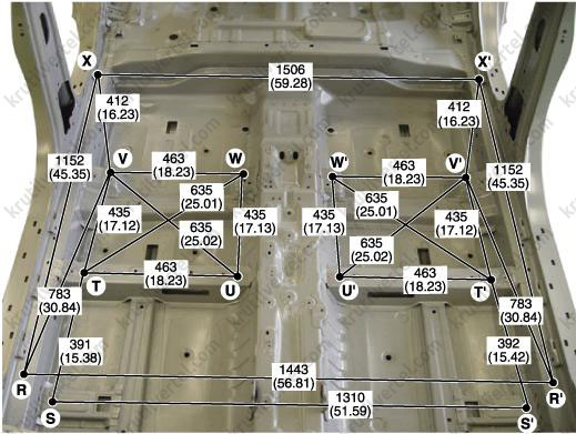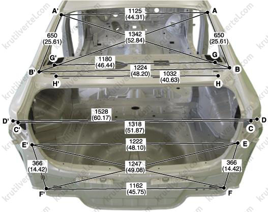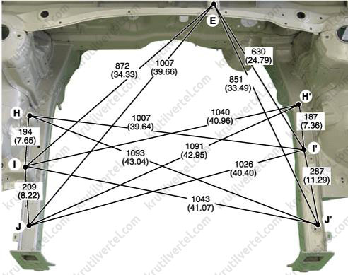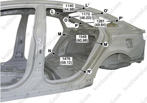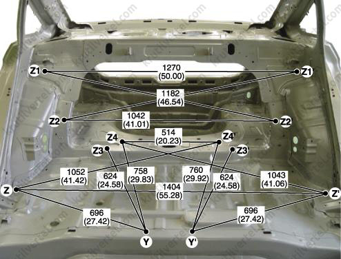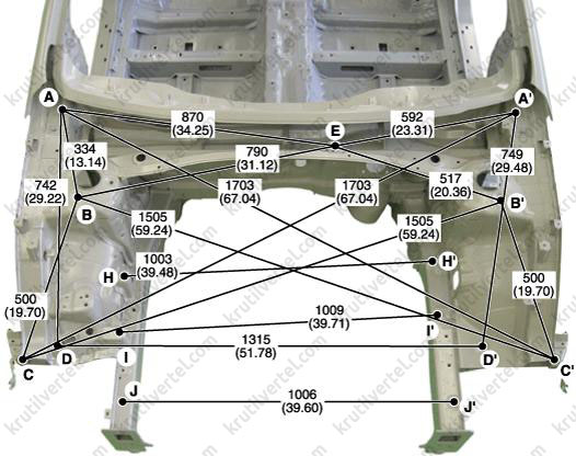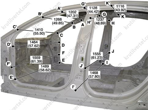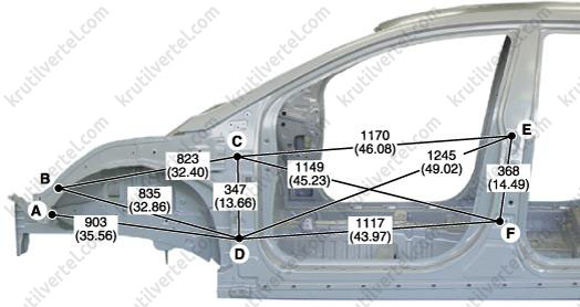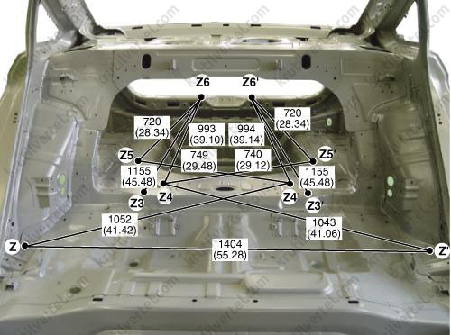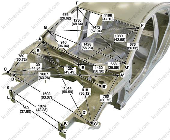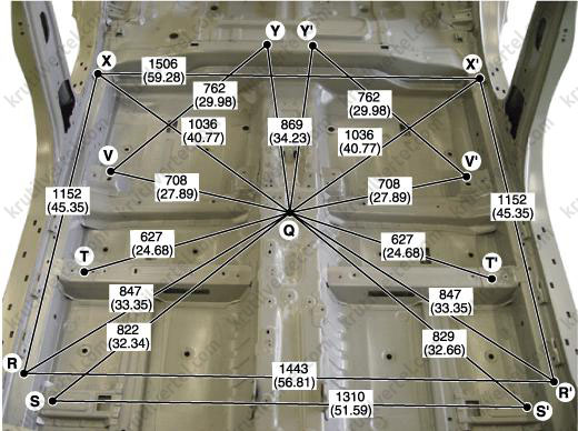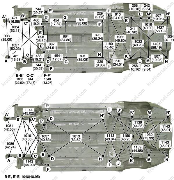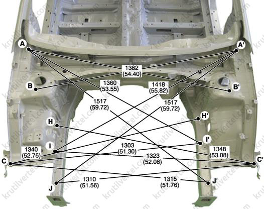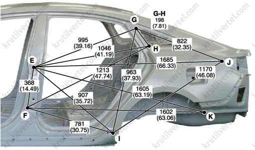 1. Проекционные размеры представляют собой размеры между точками, которые являются проекциями точек на поверхности автомобиля, и являются опорными размерами, которые используются при выполнении кузовных работ.