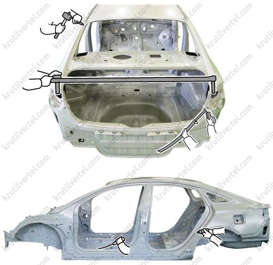 В этом руководстве описаны ремонтные работы с оболочками кузова. В некоторых случаях в местах ремонта привариваются дополнительные армирующие элементы. Процесс ремонта фактического автомобиля предусматривает полную разборку салона, при этом в качестве временной поддержки конструкции могут использоваться стандартные винтовые домкраты или распорки. Прежде чем приступать к ремонту отдельных секций автомобиля после ДТП, необходимо восстановить изначальные размеры. Затем следует оценить степень повреждений и разработать план ремонта. В этом руководстве рассматриваются места и процедуры, в которых можно применять метод деления на части. После оценки повреждений конкретного автомобиля техник по ремонту обязан определить места ремонта и спланировать операции.