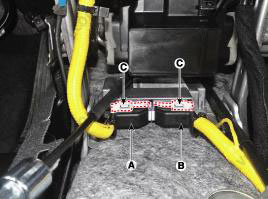 4. Потяните замки (С) разъемов SRSCM, затем отсоедините электрические разъемы (А и В).