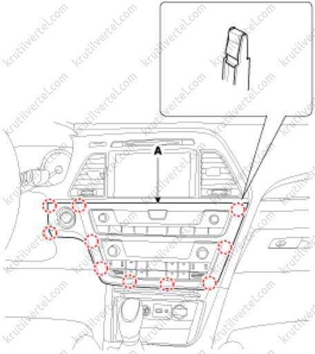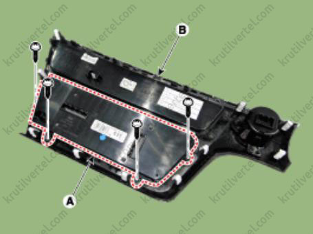 4. Отверните винты крепления и снимите панель управления кондиционером и отопителем (А) с центральной крышки передней панели (В).