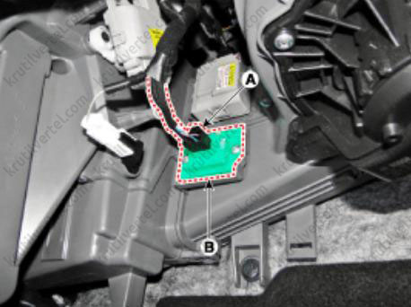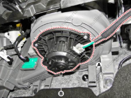 3. Отсоедините электрический разъем (A), отверните винты крепления и затем снимите электродвигатель вентилятора (В).