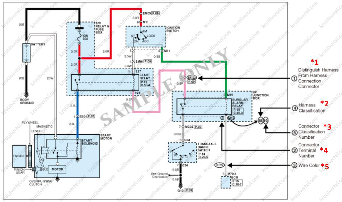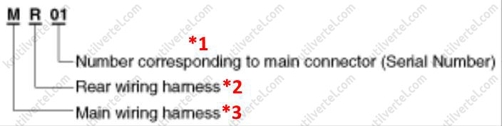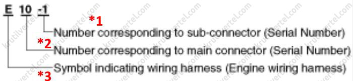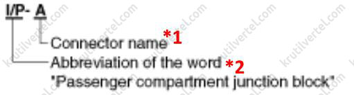 Идентификационное обозначение разъема состоит из классификационного обозначения местоположения жгута проводки, соответствующего местоположению жгута, и номера, соответствующего разъему. Местоположения разъемов приведены в РАЗВОДКЕ ЖГУТОВ.